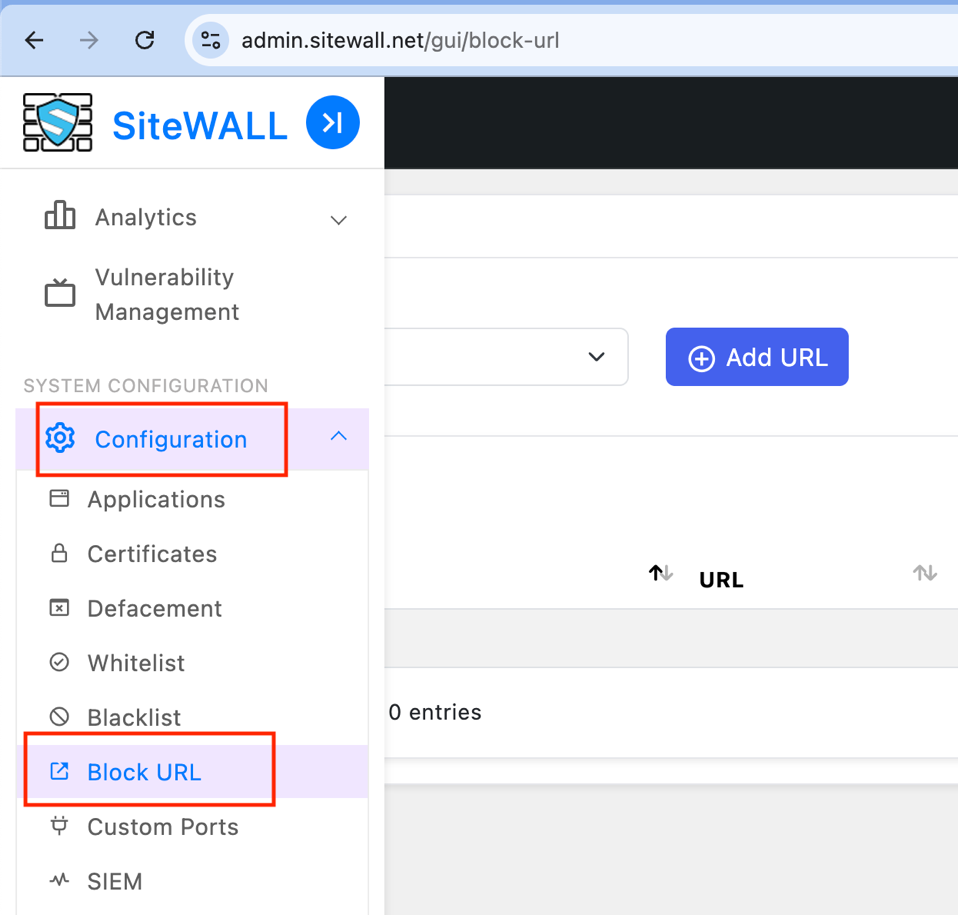 Block URL feature in SiteWALL allows administrators to restrict access to specific URLs from the public internet. This feature is essential for securing sensitive application paths, administrative panels, or testing endpoints that should not be accessible externally.
