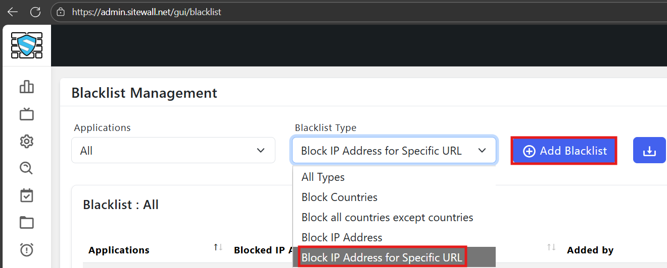 o From the dropdown, select “Block IP Address for Specific URL” and click Add Blacklist.
