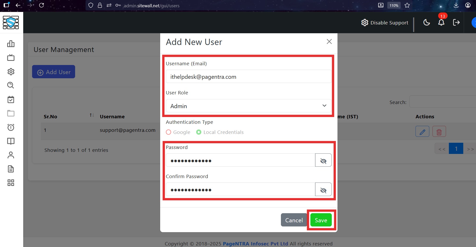 User Role | Select the appropriate role: • Admin – Full access to all configuration and management features. • Operator – Limited administrative capabilities (cannot manage users). • Reporter – Read-only access to logs and reports. |