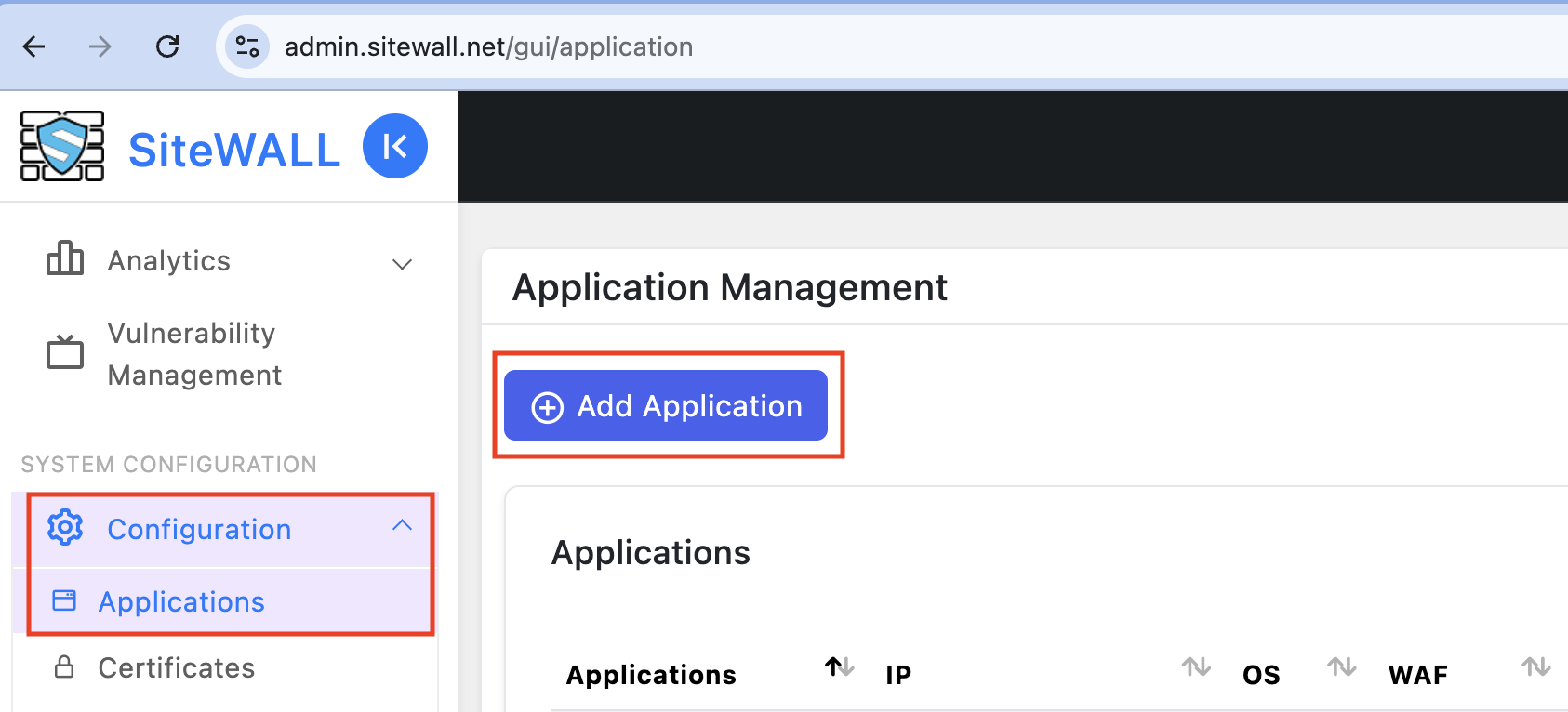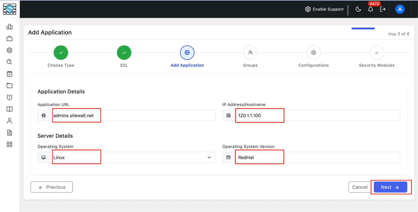 a) Enter the Application details (eg: admin.sitewall.net for application or sitewall.net for website)