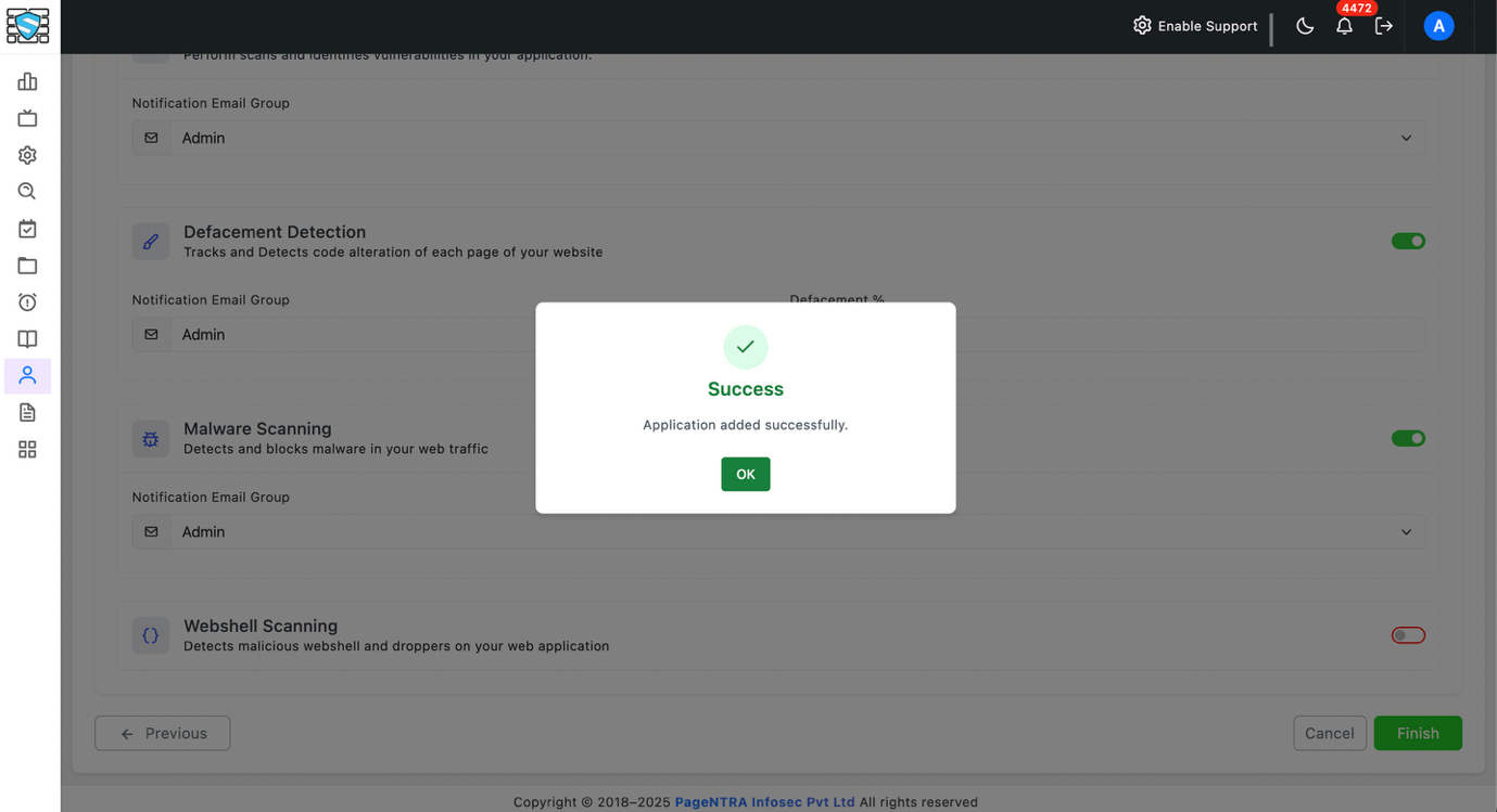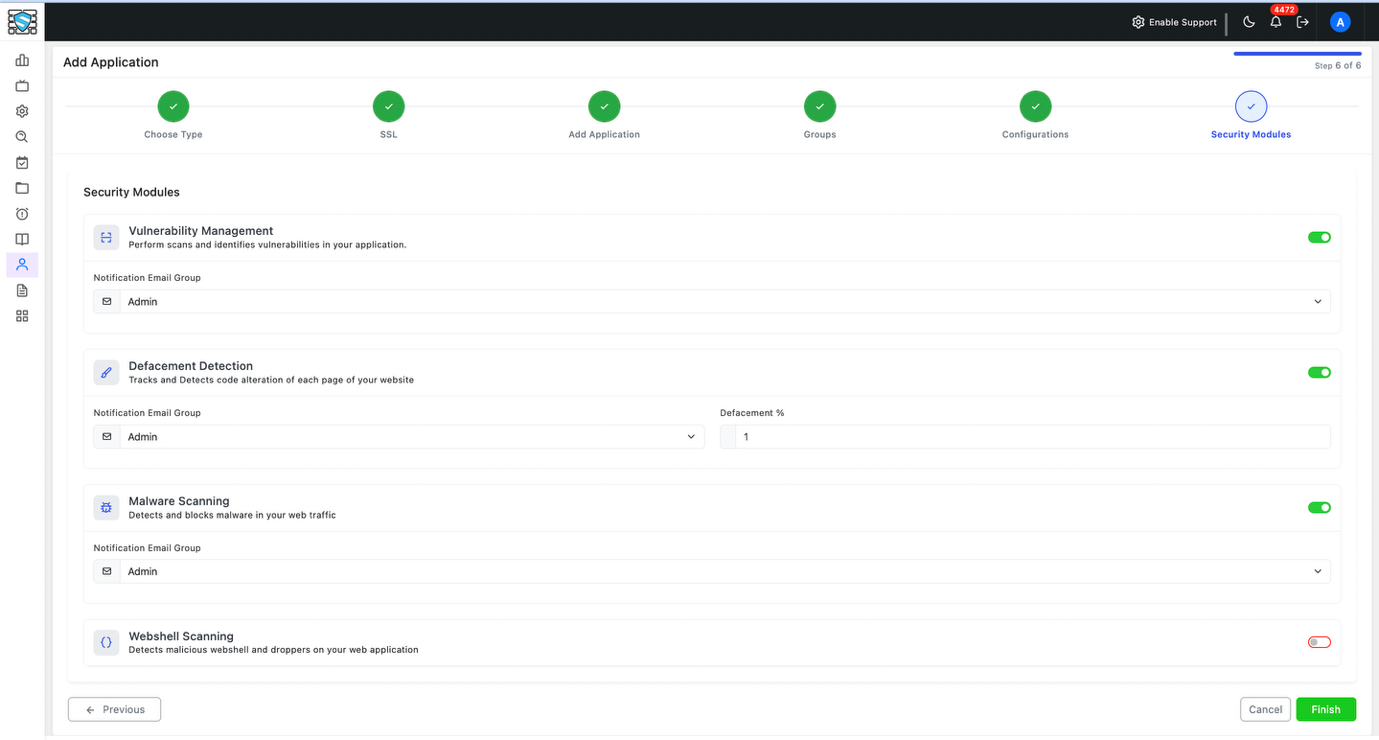 By default, all Security Modules are enabled except Webshell. Webshell requires installation of Webshell agent on your application server. Please refer to the Knowledge Base article: How to install SiteWALL Webshell agent. Enable Webshell once you have installed the Webshell agent. Review the notification group selected for each security module to ensure that alerts will be sent to the correct recipients. Once verified, click Finish to complete the configuration.
