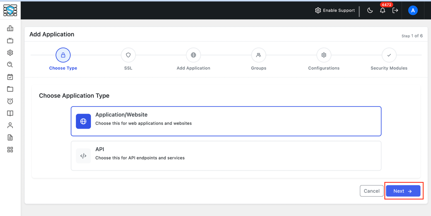 Choose the type of application you want to configure. This can be an Application, Website, or API. Select the appropriate application type based on your requirements, then click Next to proceed with the configuration.